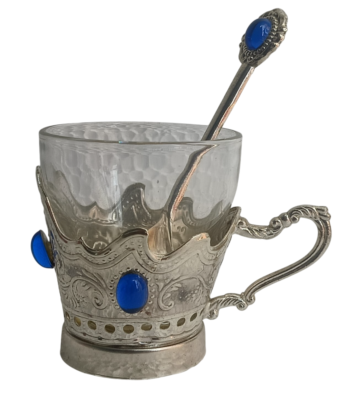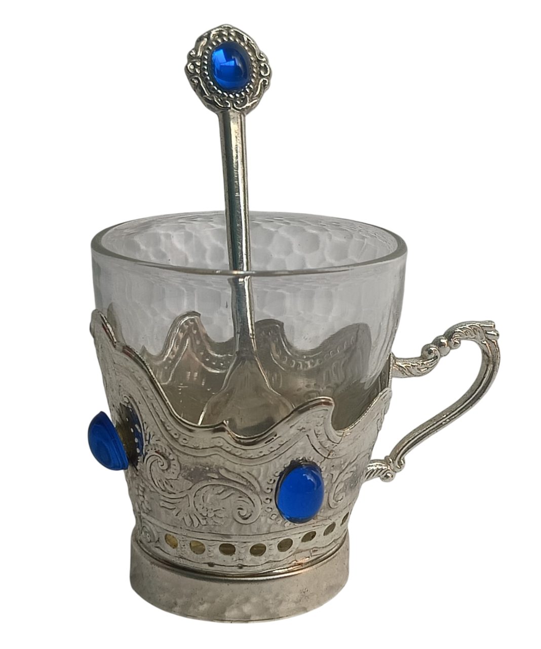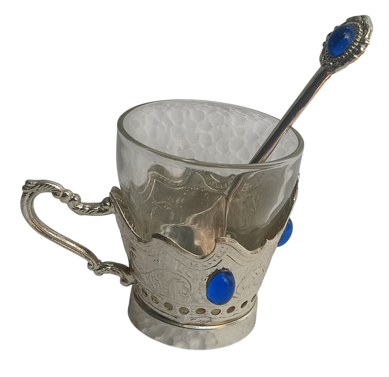 This beautifully crafted German silver cup set comes with a matching spoon. Designed with rich details and blue stone accents, it adds a traditional touch to your home. Durable, lightweight, and perfect for serving drinks in style. A wonderful blend of artistry and functionality.