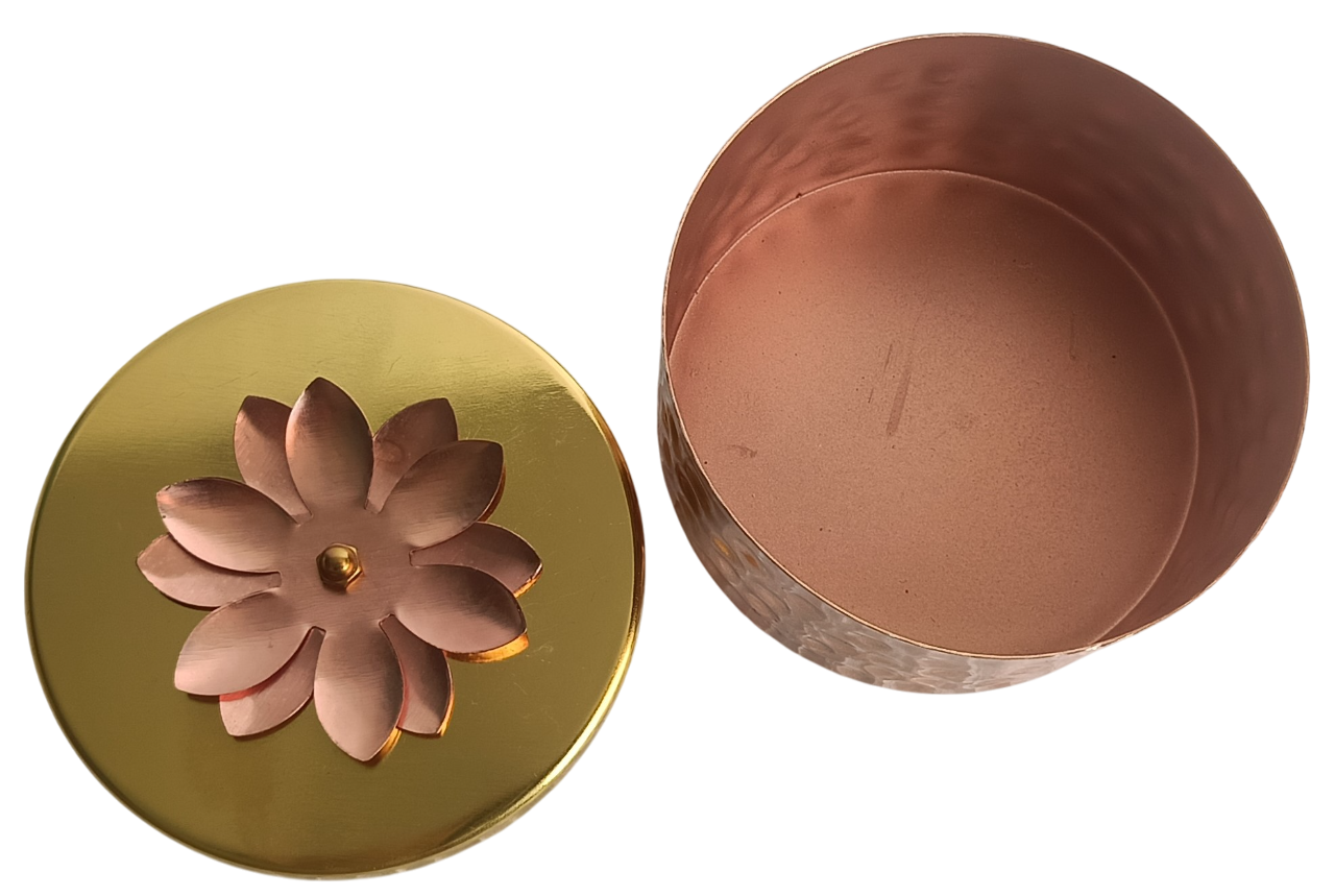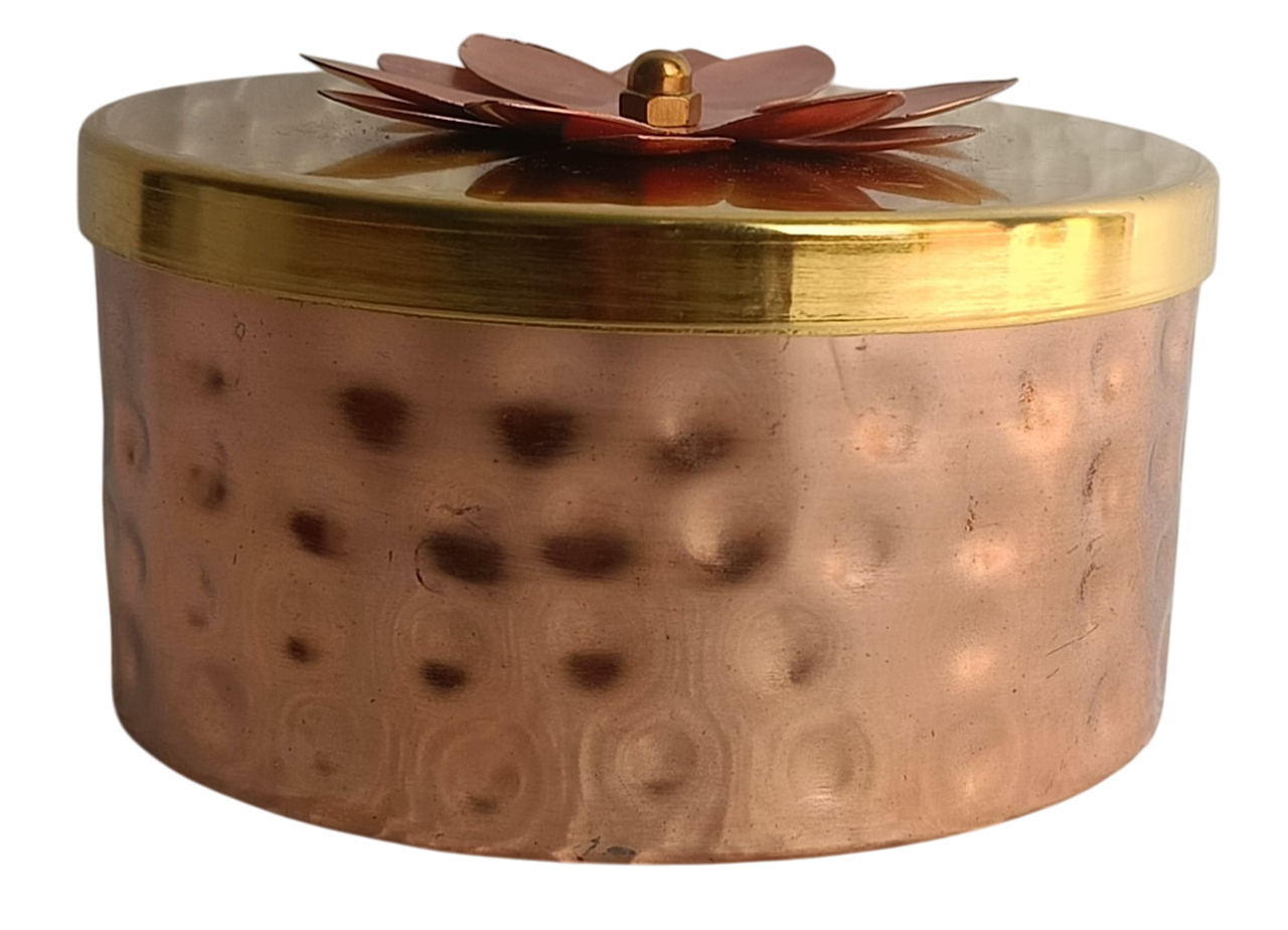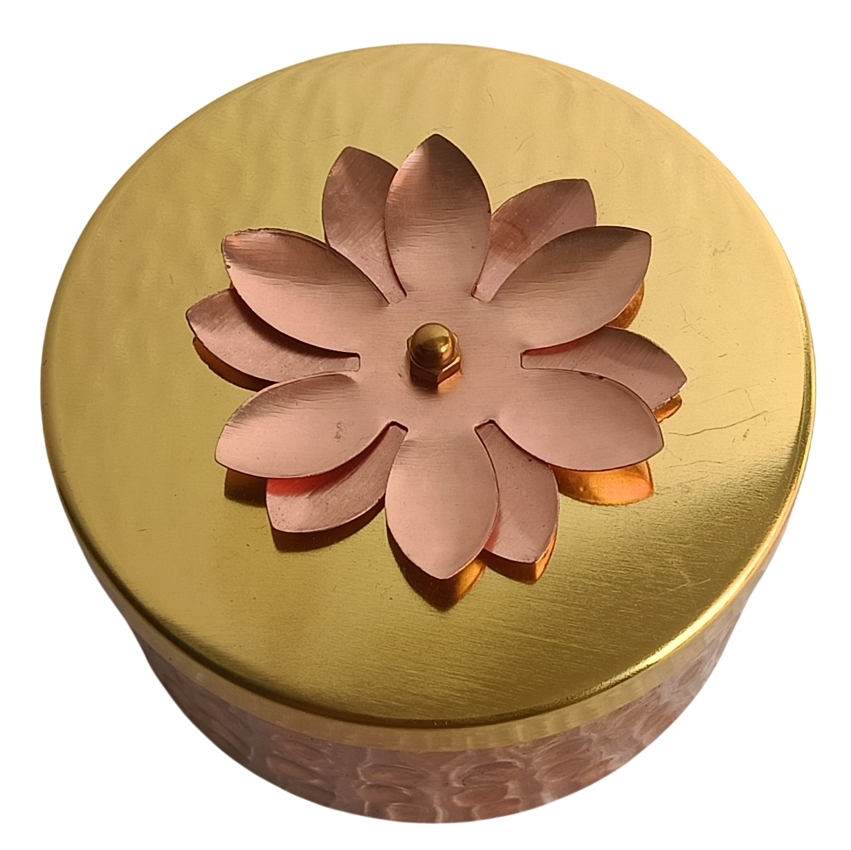 Handcrafted Hammered Copper Storage Box with Brass Flower Lid – Round Keepsake Container