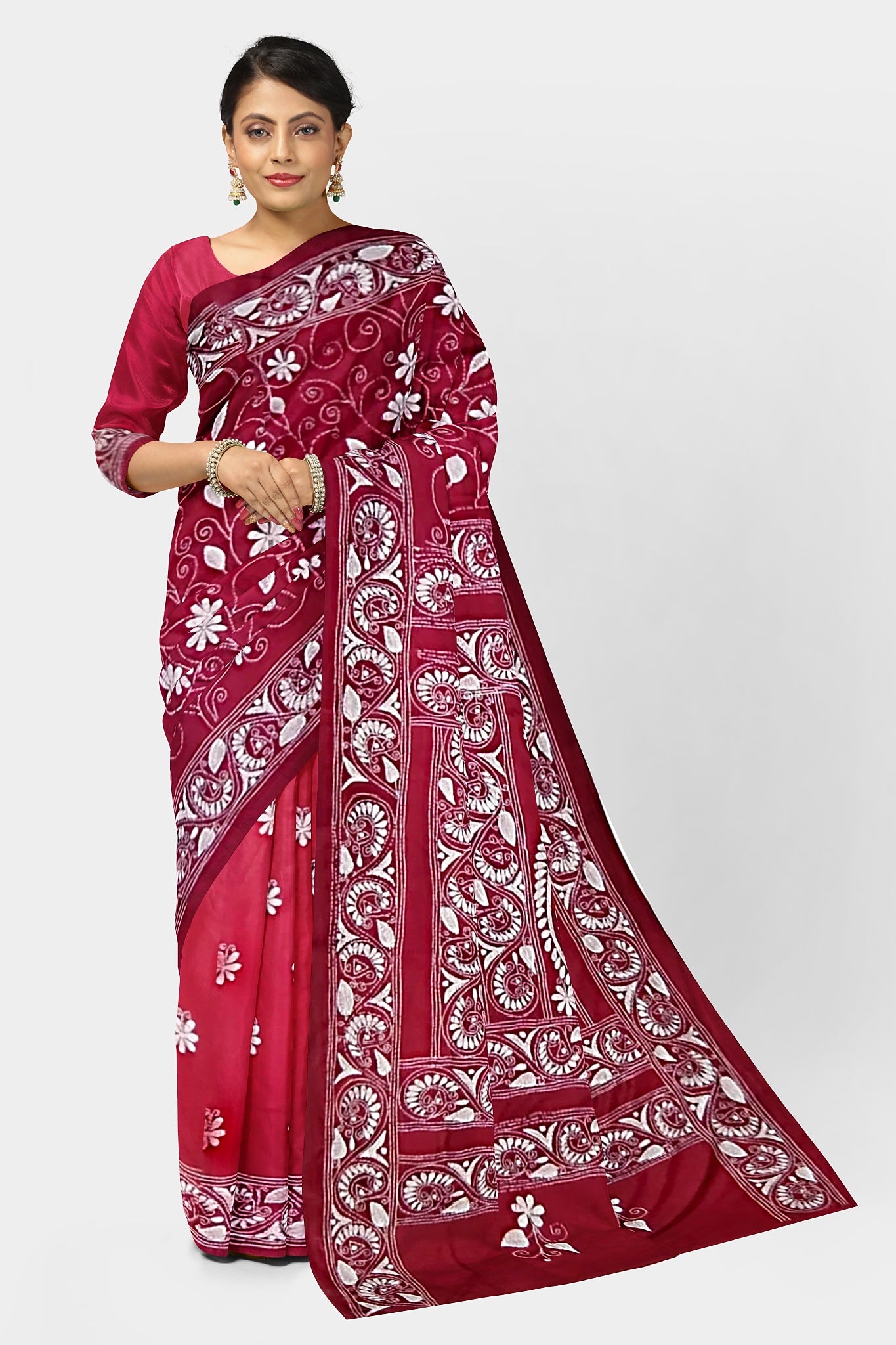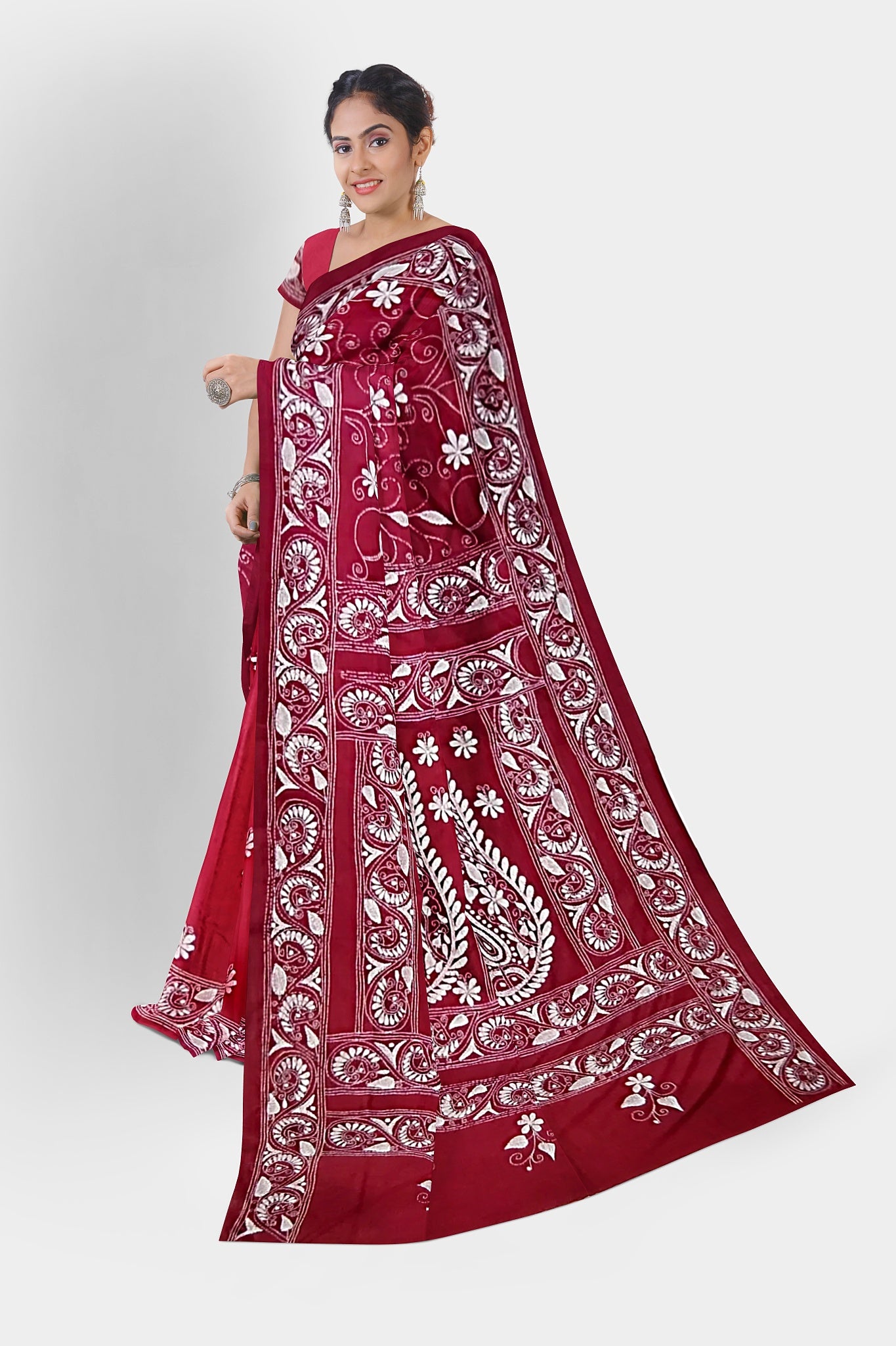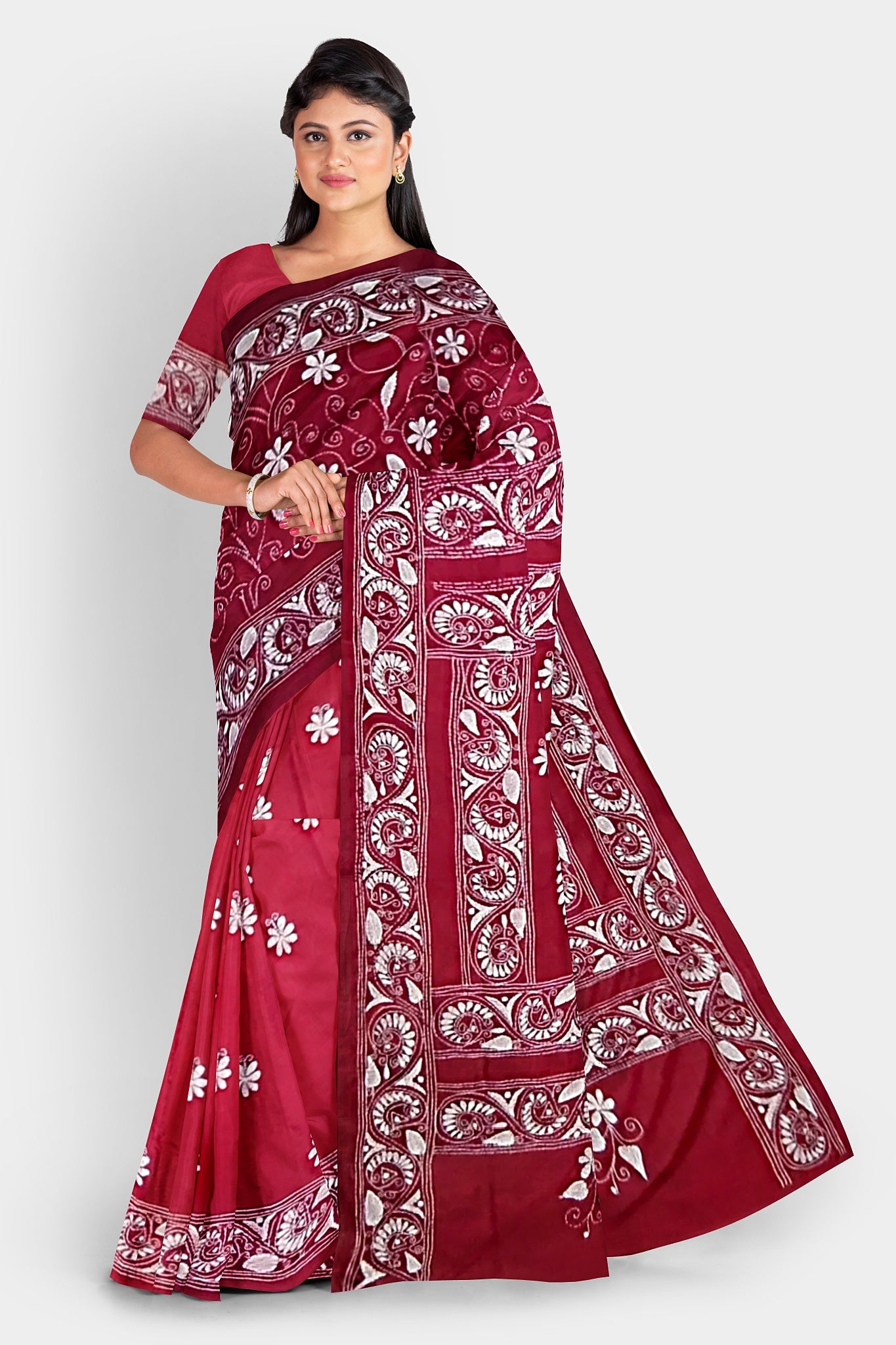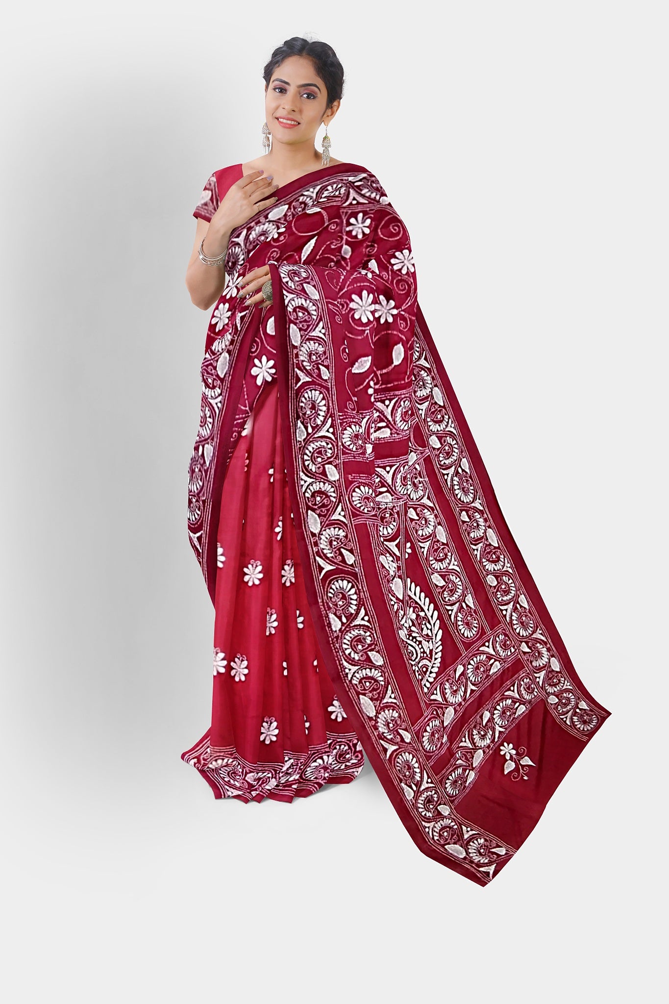 Elevate your style with our exquisite collection of Kantha Stitch Sarees for women. Crafted with the latest designs and showcasing the traditional artistry of Santiniketan, these silk sarees are a perfect blend of elegance and cultural heritage. Each saree is meticulously hand-stitched with intricate Kantha embroidery, adding a touch of uniqueness to every piece. Shop now and indulge in the timeless beauty of Kantha Stitched Silk Sarees, the epitome of grace and sophistication.
