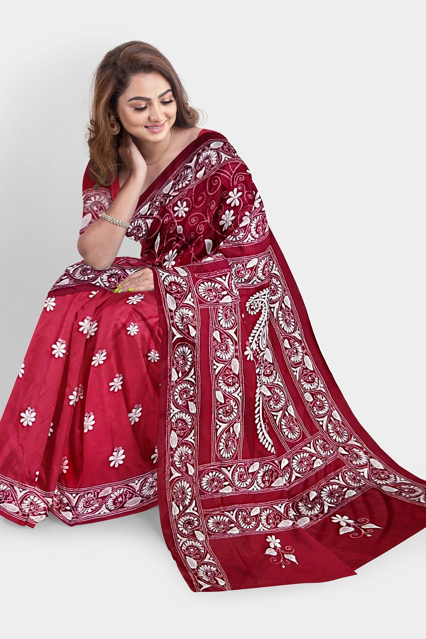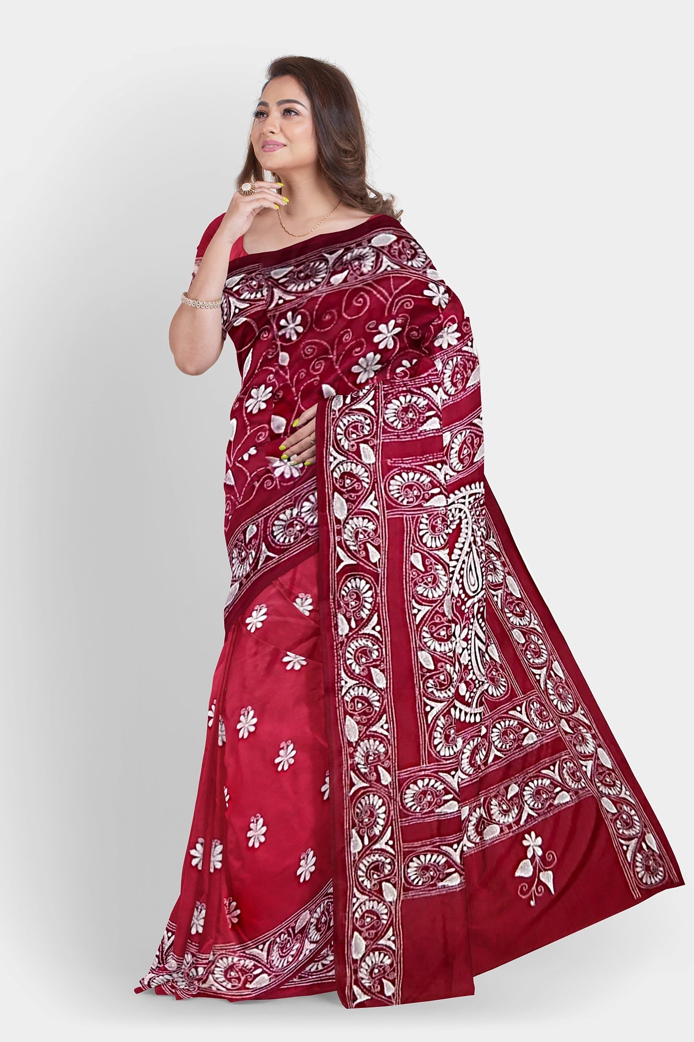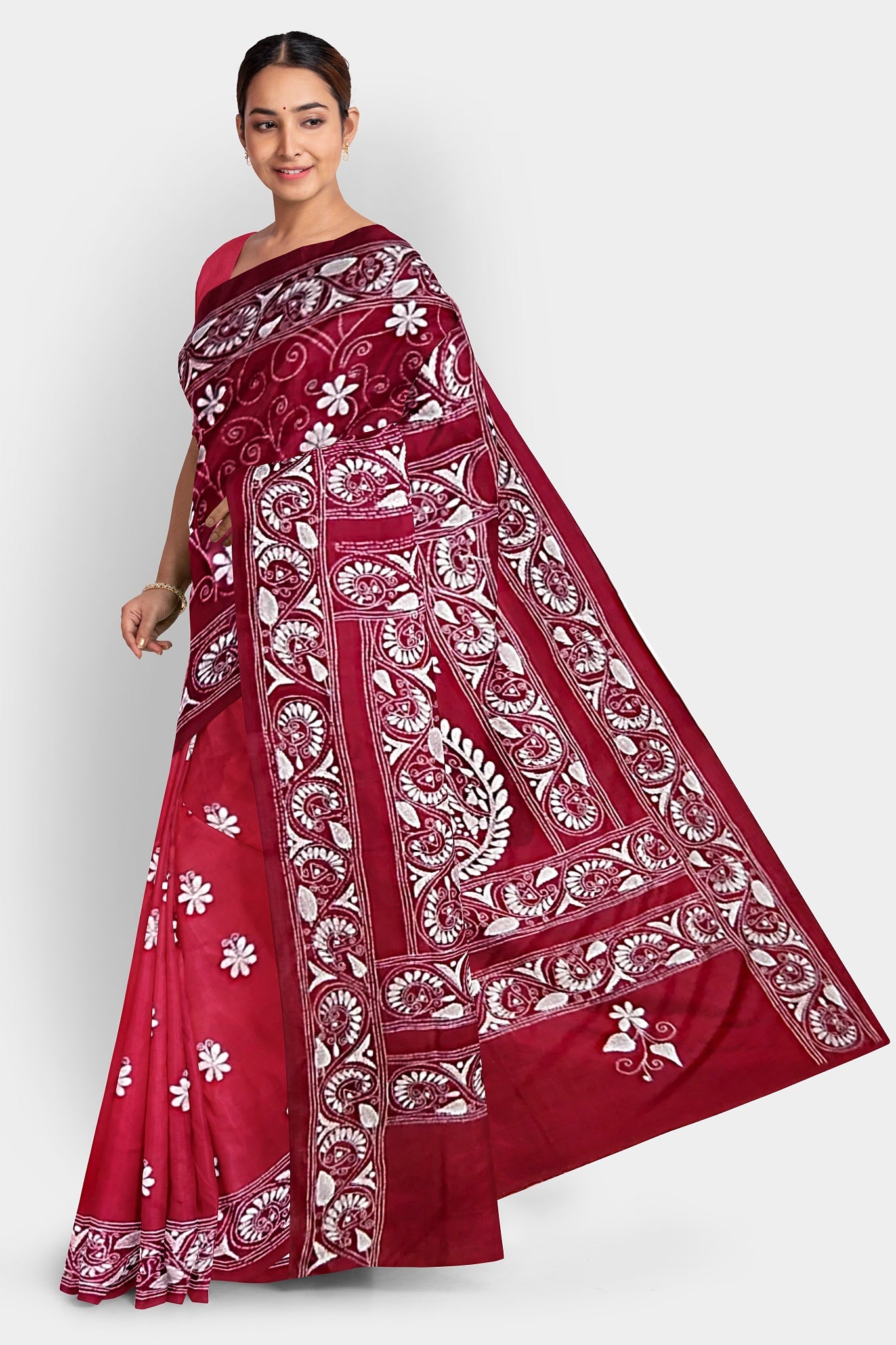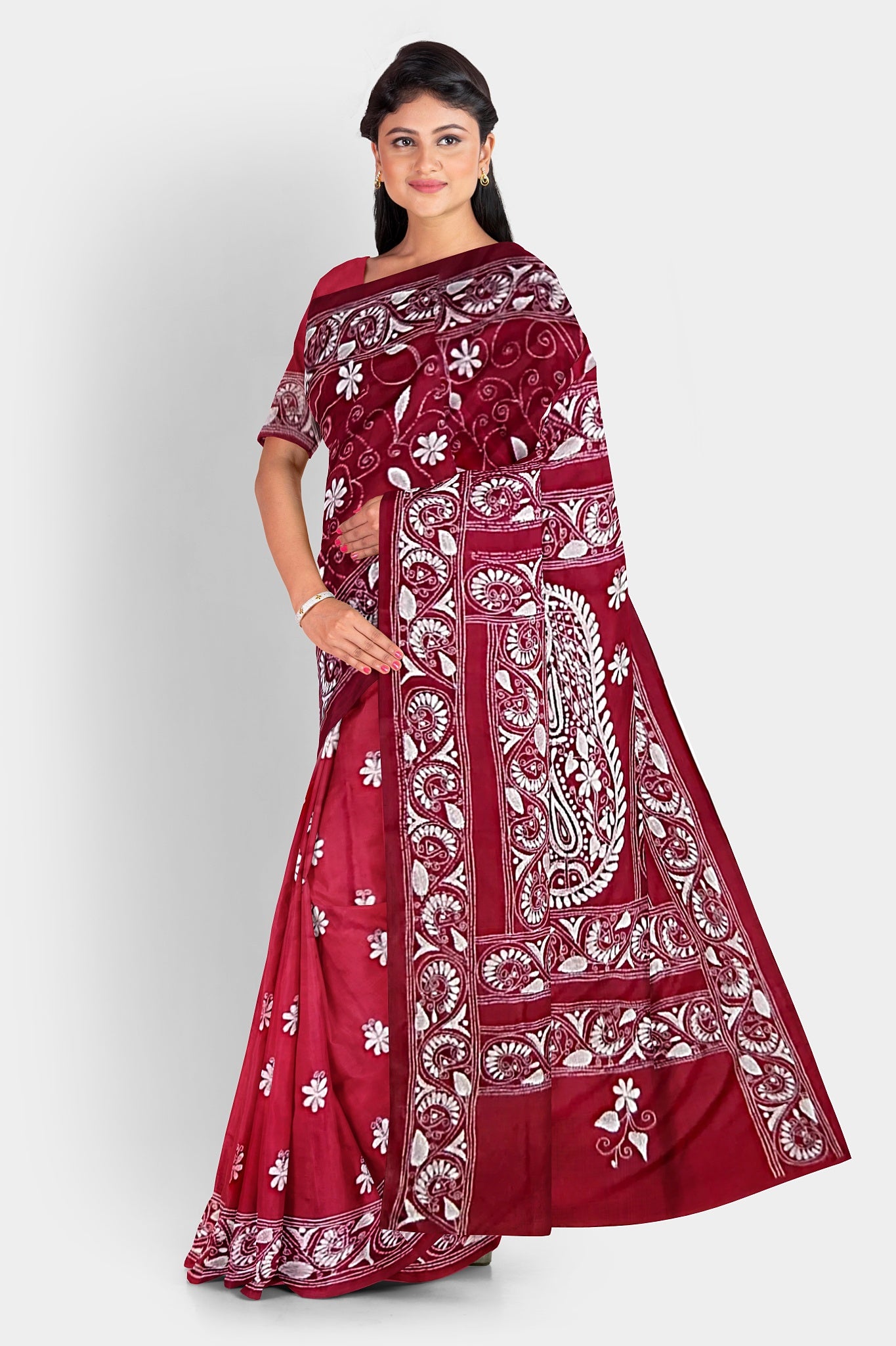 Elevate your style with our exquisite collection of Kantha Stitch Sarees for women. Crafted with the latest designs and showcasing the traditional artistry of Santiniketan, these silk sarees are a perfect blend of elegance and cultural heritage. Each saree is meticulously hand-stitched with intricate Kantha embroidery, adding a touch of uniqueness to every piece. Shop now and indulge in the timeless beauty of Kantha Stitched Silk Sarees, the epitome of grace and sophistication.