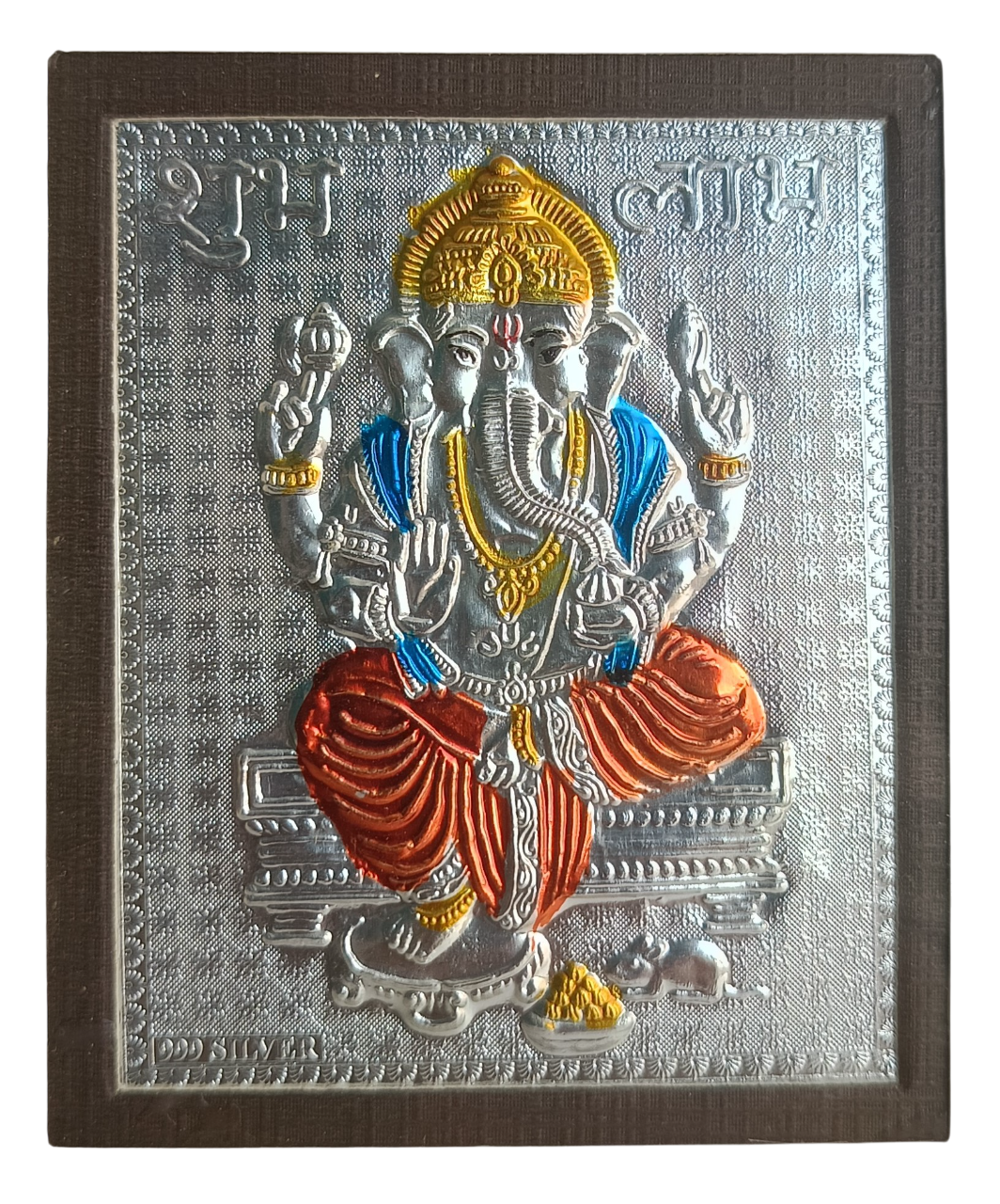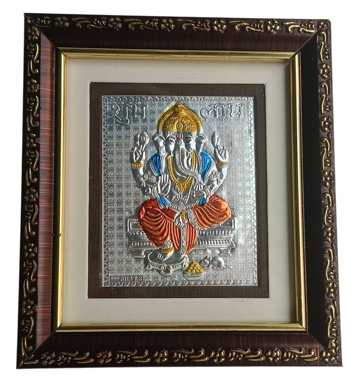 Add divine elegance to your space with this beautifully framed Panchmukhi Ganesha wall hanging made with embossed silver foil and vibrant hand painting. Representing the five forms of Lord Ganesha, this piece symbolizes wisdom, protection, and prosperity. A stunning centerpiece for your living room, pooja space, or office, and a thoughtful gift for spiritual occasions.