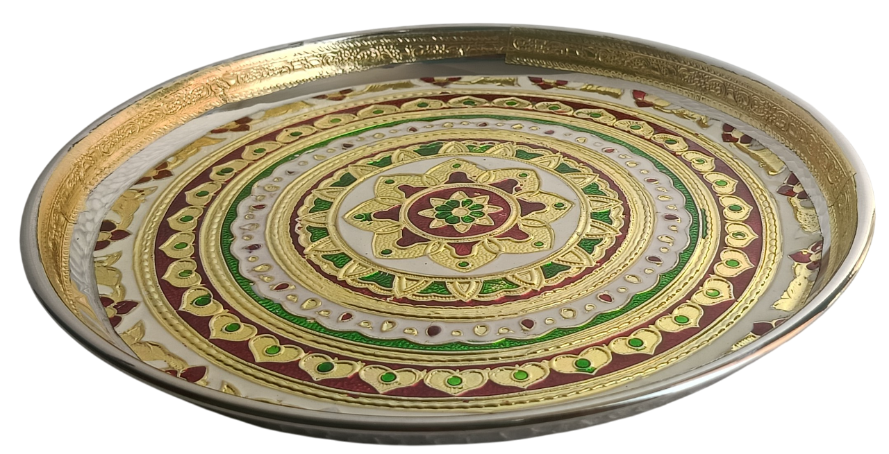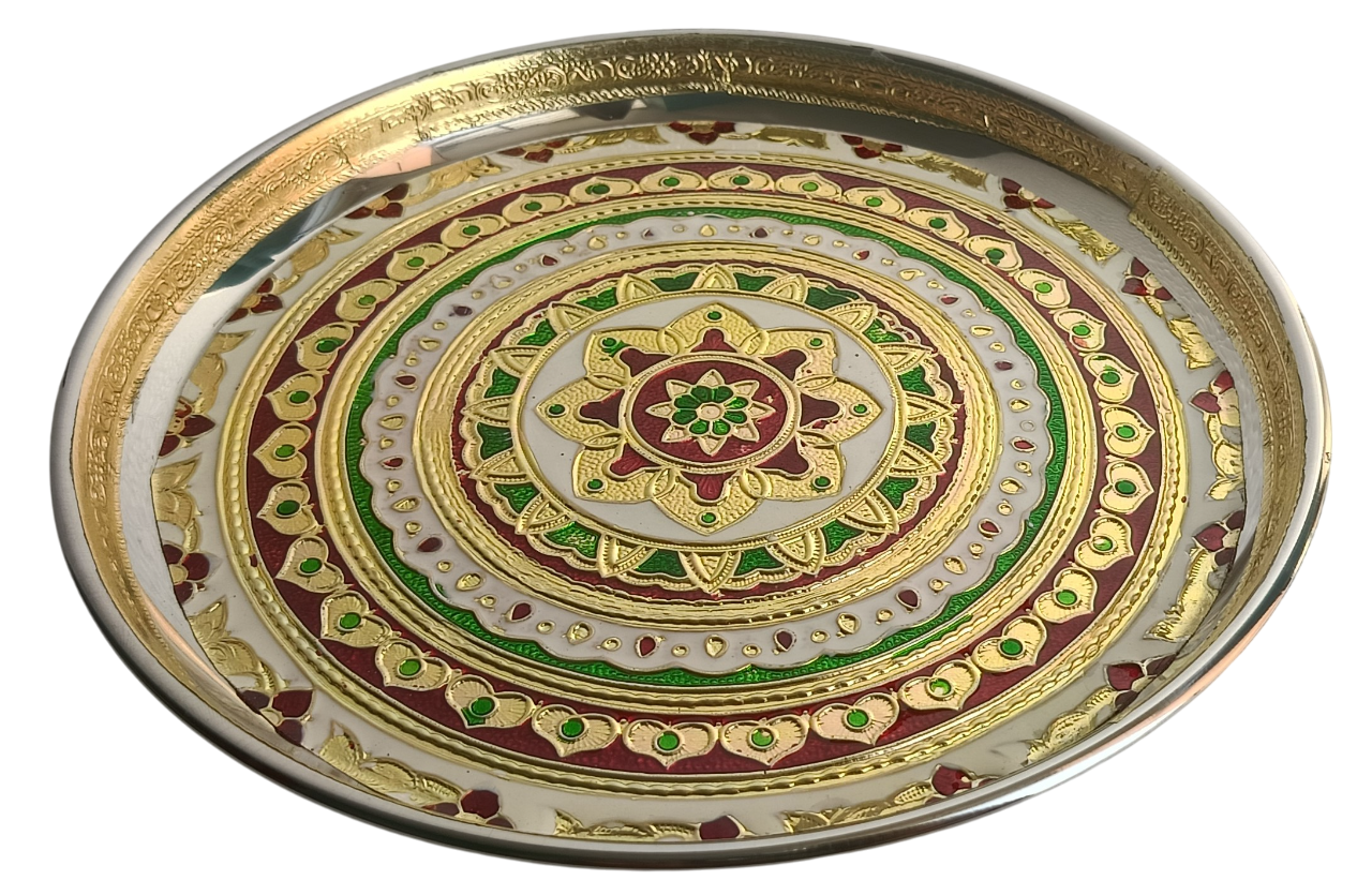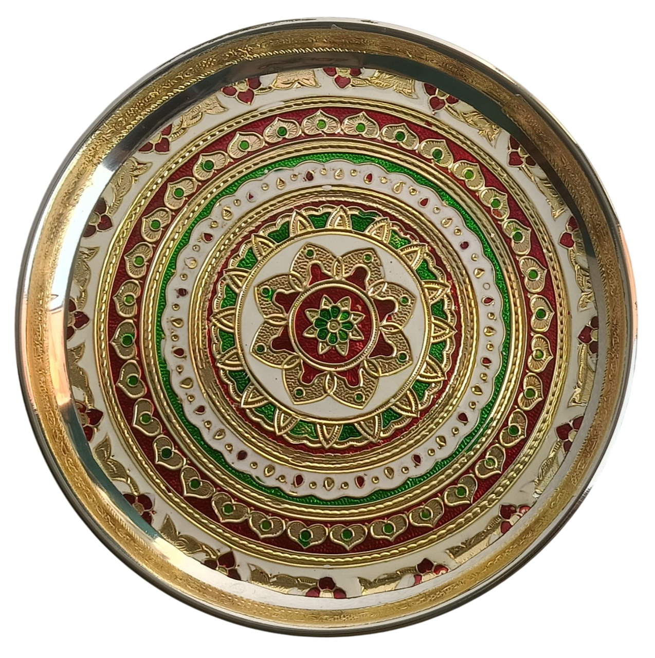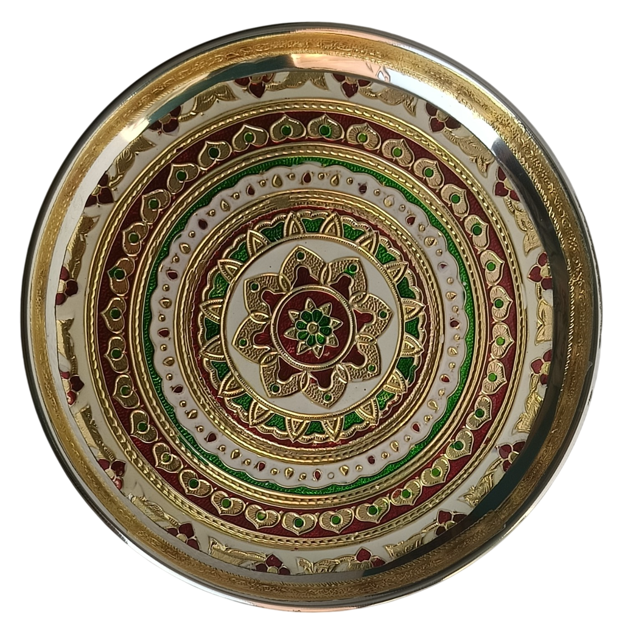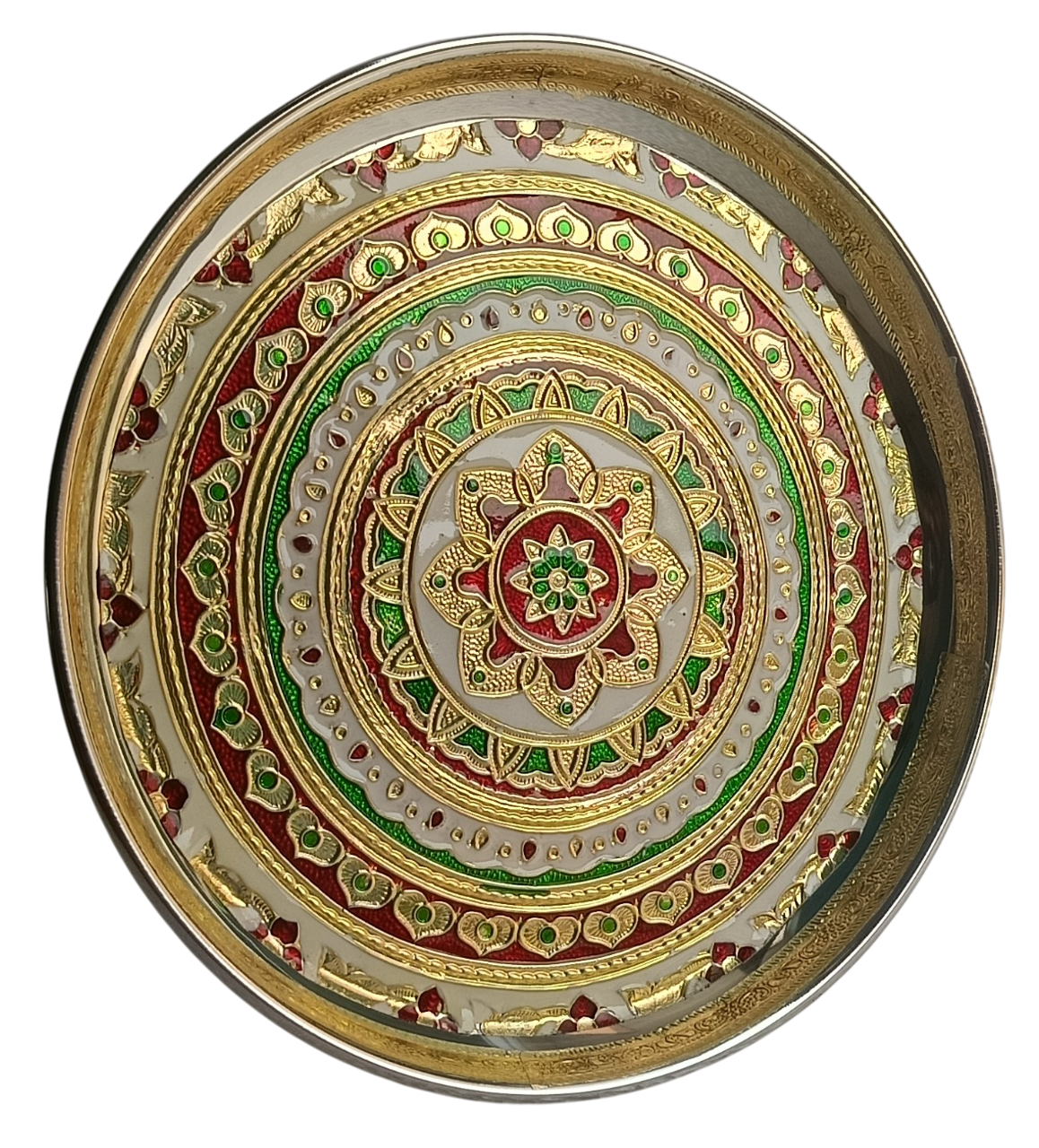 Bring traditional Indian charm to your rituals or home décor with this handcrafted Meenakari thali. Featuring a mesmerizing mandala-style center and ornate borders, it’s ideal for pooja, gifting, or festive decoration.