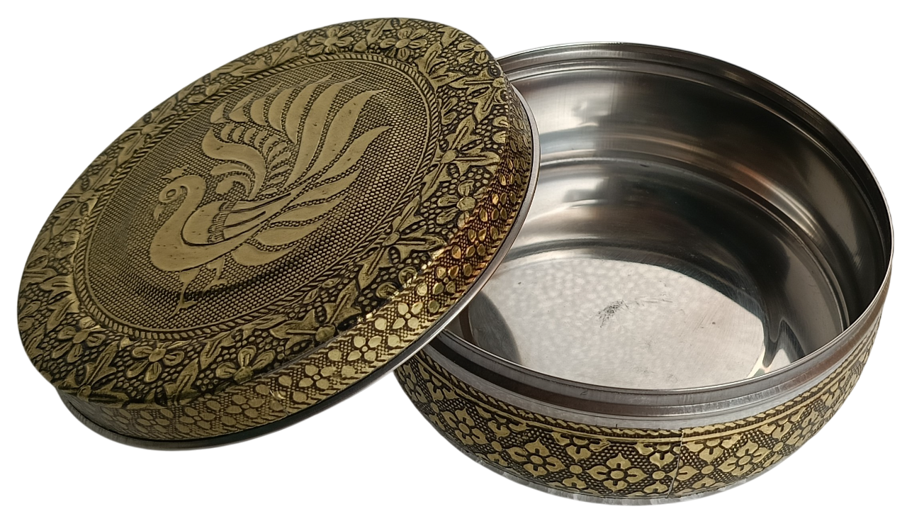 This beautifully crafted stainless steel container features intricate Meenakari-style artwork with a detailed peacock design on the lid. A perfect blend of tradition and utility, this box is ideal for storing dry items, jewelry, or as a gift. Its golden floral pattern adds elegance to any home decor.