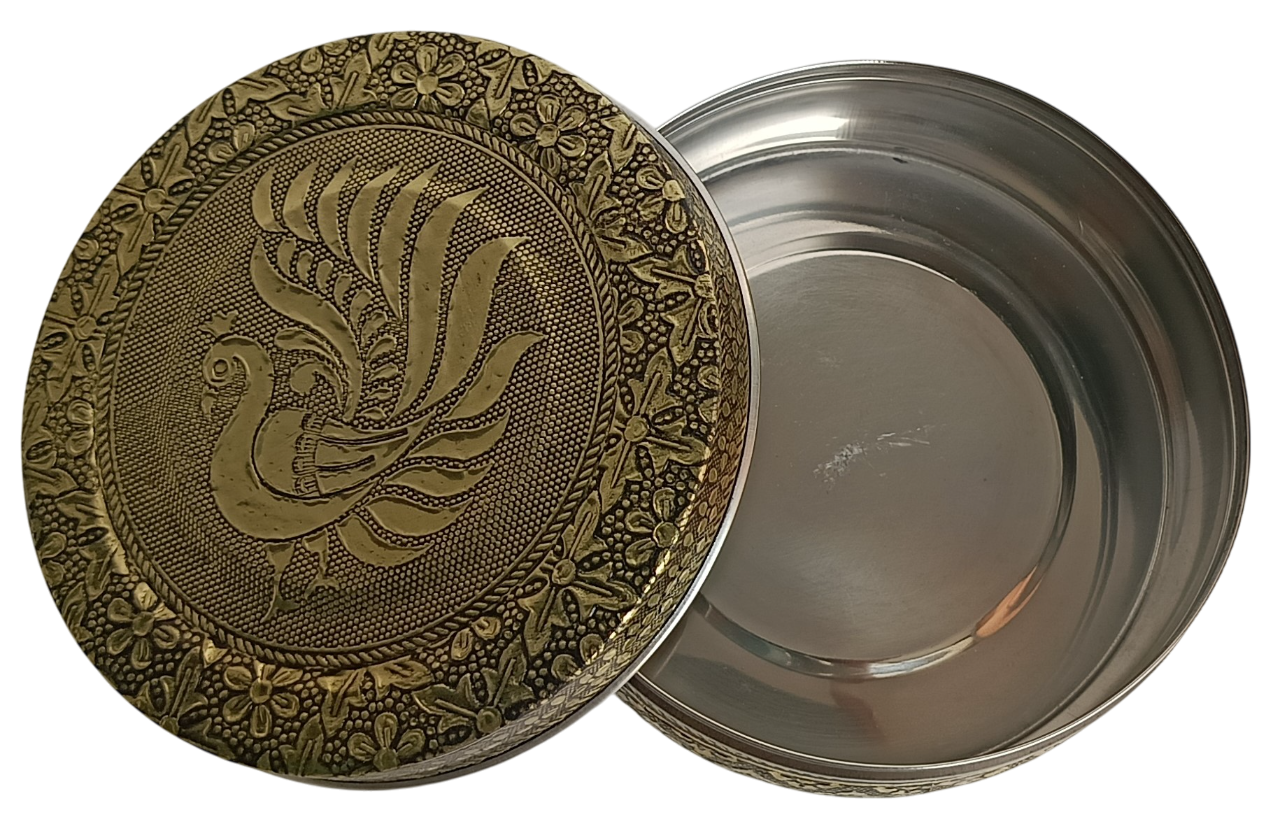 Traditional Meenakari Stainless Steel Storage Box with Peacock Design – Decorative Container